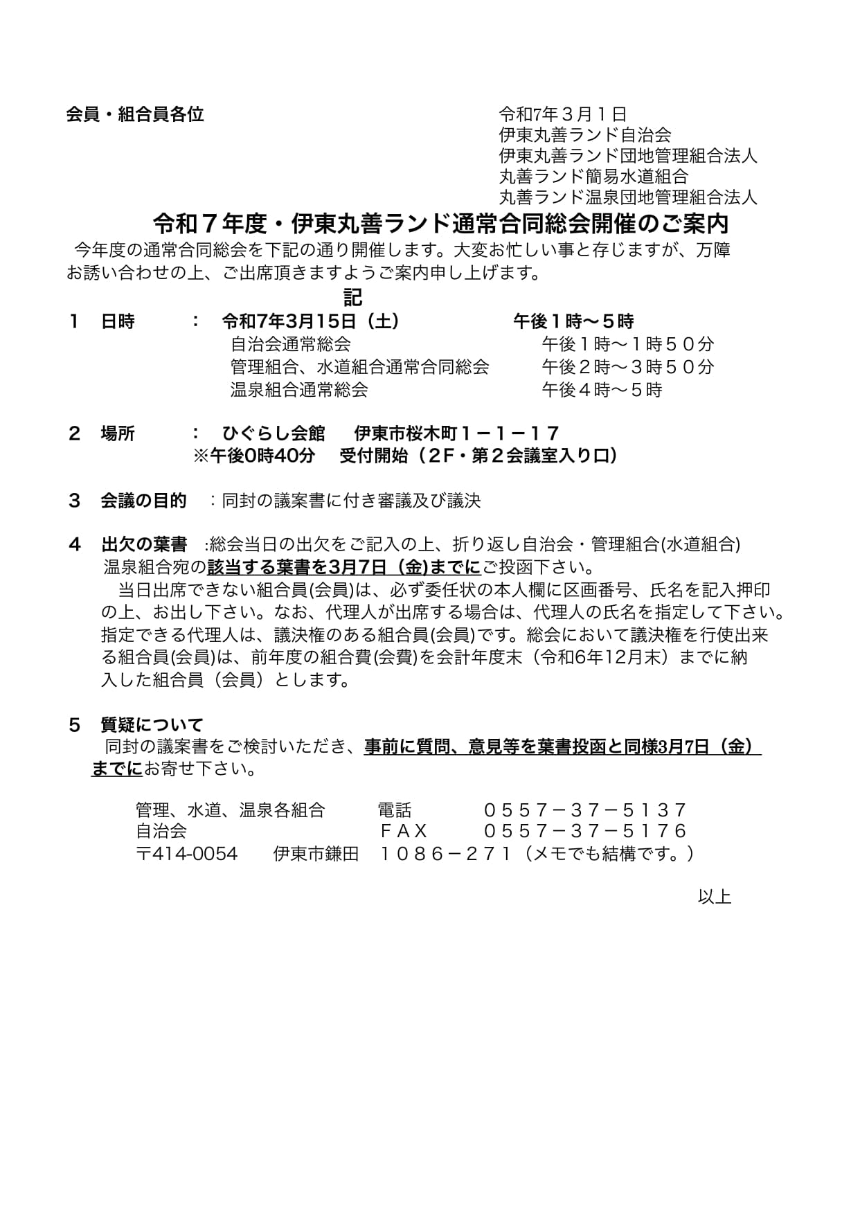 4. 出欠の葉書: 総会当日の出欠をご記入の上、折り返し自治会・管理組合(水道組合)温泉組合宛の該当する葉書を3月7日(金)までにご投函下さい。
