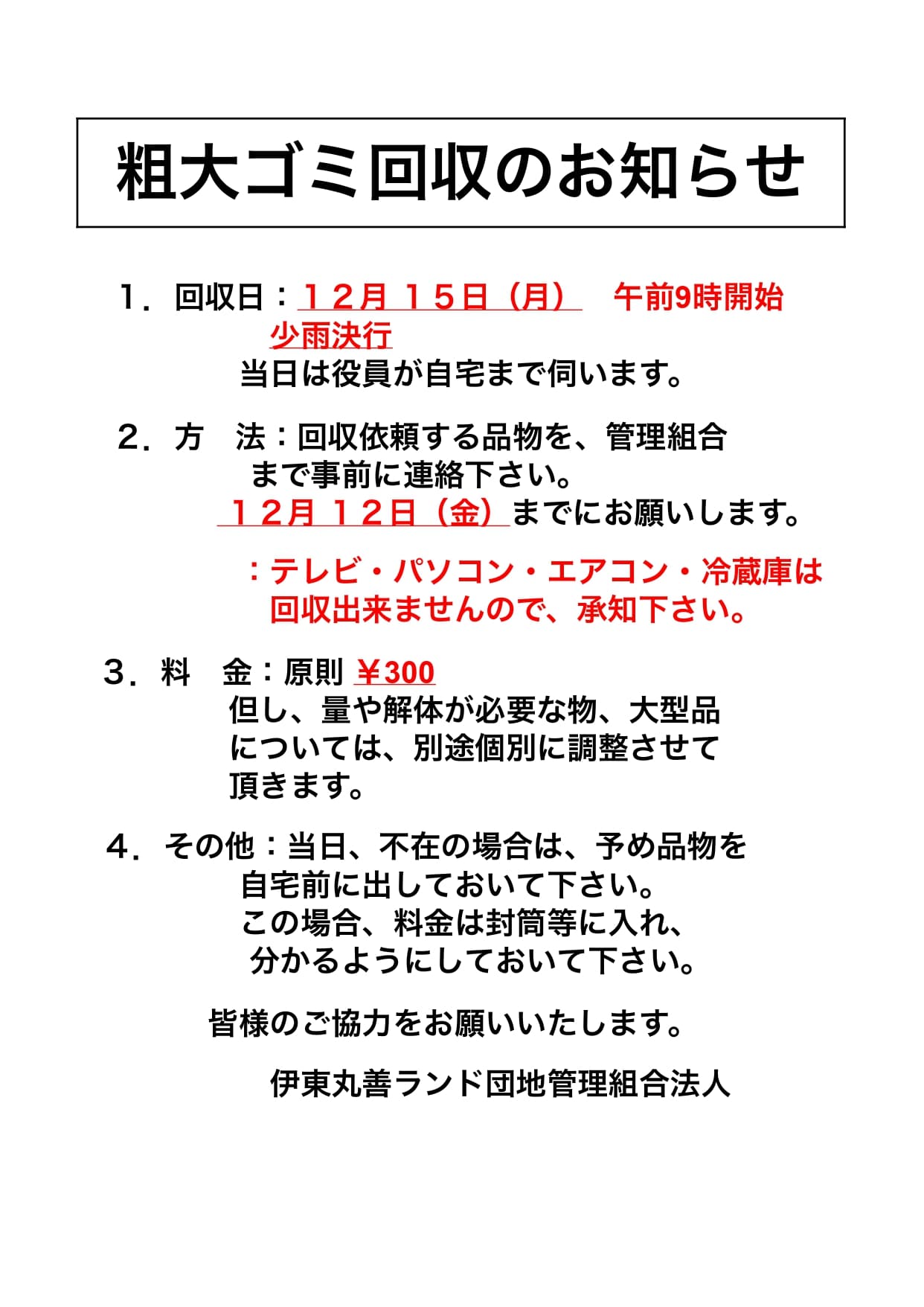2. 方 法:回収依頼する品物を、管理組合まで事前に連絡下さい。