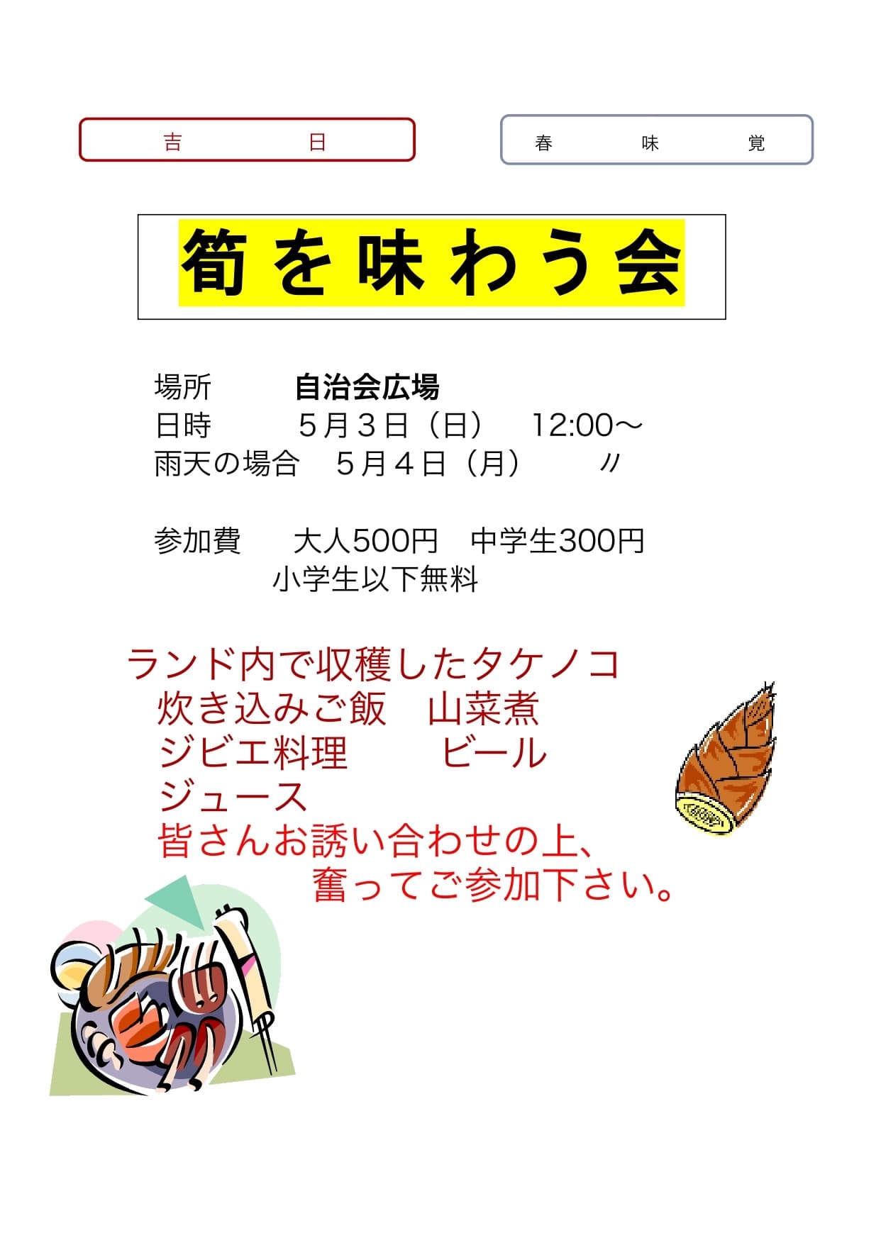 そこで今年も春の恒例行事として「筍を味わう会」を開催いたします。